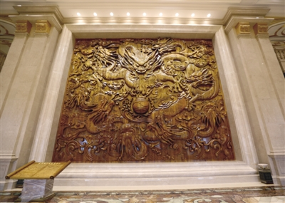 权健华东国际会议中心内部一座由金丝楠木制作而成的九龙壁可谓“镇店之宝”