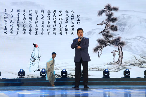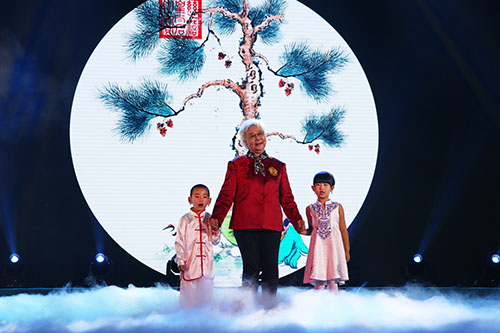 “我为一挥手,如听万壑松。”浑厚悠远的古琴声将观众带入了“万壑松林间”。只听“一斤松花不可少,八两蒲黄切莫炒……”的稚嫩童声转为玉珠走盘的悦耳琵琶声,此时,已入耄耋之年的田华老师在松花宝宝的陪伴下步入舞台中央,为大家带来了气势如虹的《南轩松》诗朗诵,让大家感受到松树坚韧顽强的生命力。“腹空先进松花酒……乐天知命了无忧”,朗诵艺术家瞿弦和带来了大家熟悉的《枕上行》诗朗诵,揭示了松树长寿的奥秘和健康的价值。紧接着,由三星以上领导人组成的新时代朗诵团献上了陈毅的名作《青松》的朗诵,这首诗是对松树品格的赞扬,更是新时代人形象的完美展现。朗诵是门语言艺术,由新时代朗诵团与著名朗诵艺术家殷之光合诵的《黄山松》将现场气氛推向高潮,激情饱满的朗诵震撼全场,将松树“立于天地间,不畏风和雪,万物皆凋敝,唯我万年青”的坚韧品格演绎得淋漓尽致。