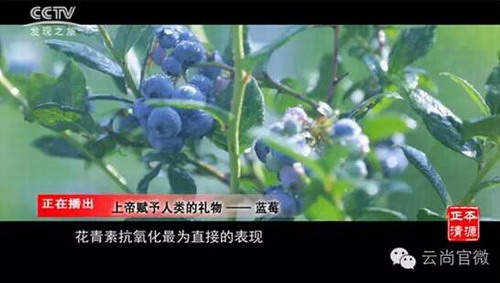 中央电视台(CCTV)《发现之旅》频道《正本清源》栏目播出吉林云尚保健食品有限公司的蓝莓,节目以专业的角度剖析蓝莓的营养价值、蓝莓产业的巨大发展潜力。