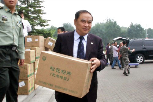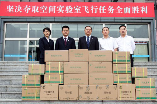 飞船发射前期,新时代健康产业集团总经理黄永刚先生与国内直销事业部总经理杨少华先生来到航天员训练中心,向着陆场任务试验队指战员表达了千万新时代人的慰问和祝福,并赠送了松花粉等公司产品,希望各位指战员可以藉此保持良好的身体健康状况,圆满完成任务。