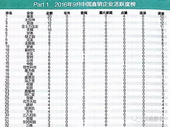 中国直销企业9月活跃度榜出炉 双迪登前三甲