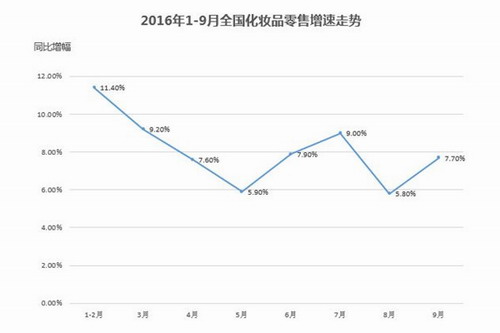 国家统计局同时汇总了前9个月的整体数据:2016年1-9月份,社会消费品零售总额238482亿元,同比增长10.4%;1-9月化妆品零售总额1595亿元,同比名义增长8.4%。