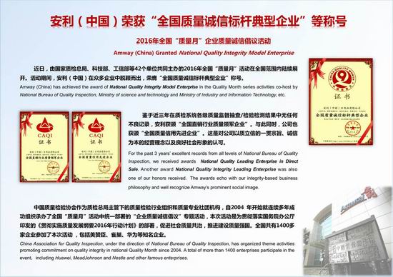 鉴于近三年在质检系统各级质量监督抽查/检验检测结果中无任何不良记录,安利获颁“全国直销行业质量领军企业”。与此同时,公司也获颁“全国质量信用先进企业”。这是对公司以质立信的一贯宗旨、诚信为本的经营理念以及良好社会形象的认可。