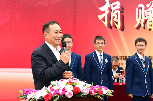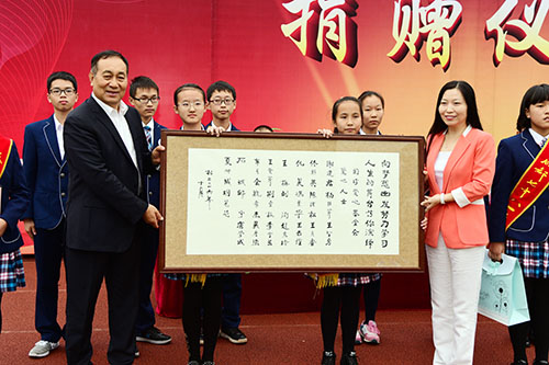 国珍市场发展咨询委员会委员冯景华、邱宁向校方赠寄语牌匾