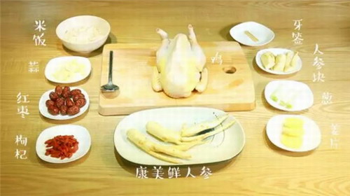 食材:新鲜人参1支,童子鸡1只,糥米100克、红枣10颗、姜3克、葱3克、盐5克。