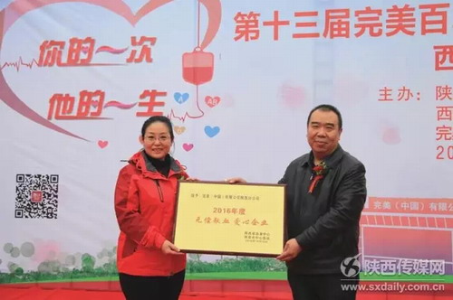 完美陕西分公司自2001年开展无偿献血活动以来,累计献血总人数已超过3500人次,总献血量逾96万毫升。2010年6月,陕西分公司成为西安地区应急血库成员单位。2014年12月荣获“全国无偿献血促进奖”称号,2014年度全省仅有两家单位获此殊荣。