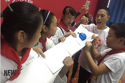 跟志愿者叔叔一起,完成生命水球的游戏