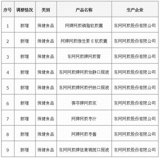 10月27日,商务部直销行业管理信息系统网站公示东阿阿胶股份有限公司调整直销产品信息。东阿阿胶此次新增保健食品9款,详细信息如下: