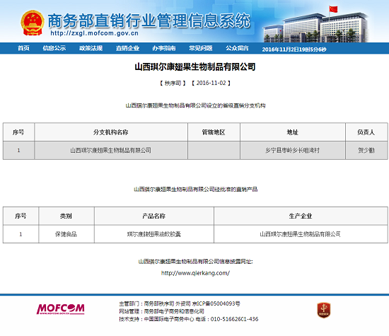 2016年11月2日,商务部直销行业管理信息系统网站公布山西琪尔康翅果生物制品有限公司获得直销经营许可证信息。据悉琪尔康是山西第一家拿牌直销企业,现在商务部网站公示的拿牌直销企业也达到了79家。商务部网站信息显示,琪尔康直销产品获批1款保健食品,服务网点、直销培训员等信息目前暂未公布。详情如下: