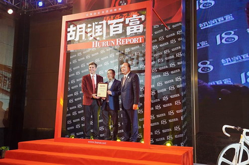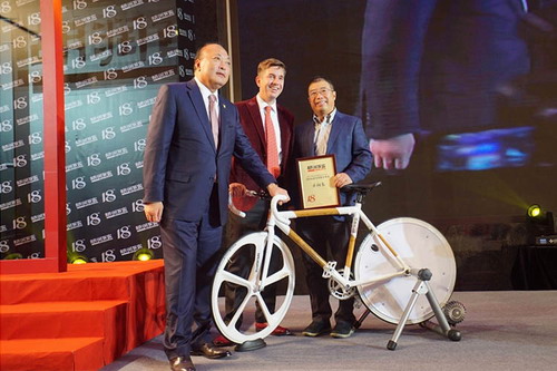 李金元董事长作为颁奖贵宾与胡润先生共同为奇虎360总裁齐向东先生颁发“最受尊敬企业家年度奖项”并赠送“竹制环保自行车”