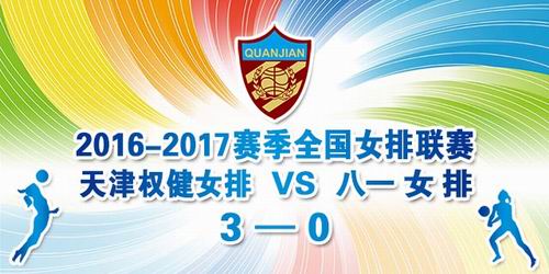 2016年11月8日19时30分,2016-2017赛季全国女排联赛第三轮重燃战火,天津权健女排坐镇天津人民体育馆,主场迎战八一女排。整场比赛,天津权健女排姑娘发挥出色,经过三局的激烈角逐,最终以3比0战胜对方,收获三连胜。三局比分分别为,25比13、25比23、25比16。