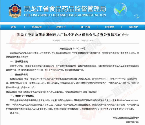 2016年4月15日,黑龙江省局收到哈药集团制药六厂生产的女士高盖牌钙片不合格产品检验报告后,立即责成哈尔滨市食品药品监督管理局启动核查处置工作,责令哈药集团制药六厂召回、停止生产不合格产品,并立案开展调查工作。
