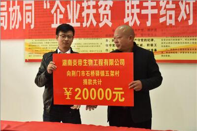 2016年11月8日,炎帝生物百年树人基金会带着对父老相亲的关爱走进了荆门市石桥驿镇五架村,为这里的相亲带来了20000元的爱心捐款。参与本次活动的有荆门市工商局李局长、荆门市工商稽查局熊局长、五架村村委会成员、湖南炎帝生物工程有限公司以及其他几家爱心企业。