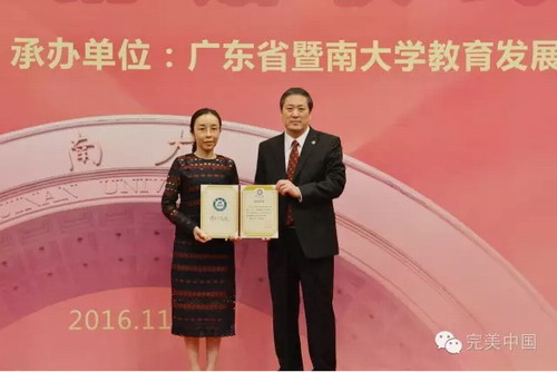 暨南大学校长胡军向完美公司颁发捐赠证书