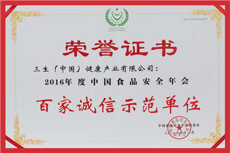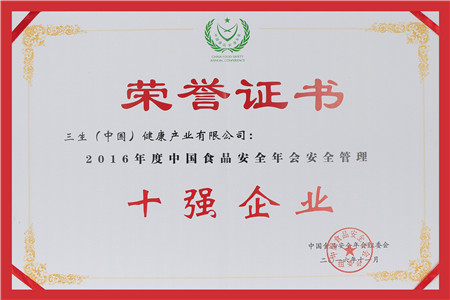 三生(中国)荣获“2016年度中国食品安全十强企业”