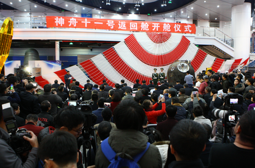 2016年11月22日下午,中国载人航天工程办公室和中国航天科技集团公司在京举行神舟十一号飞船返回舱开舱仪式,与研制单位和搭载单位代表一道,共同见证搭载物品出舱。