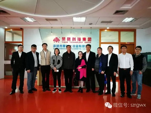 孙小玲总裁带领着公司高层参观荣科化妆品有限公司和荣格保健品有限公司的新车间,受到了荣科化妆品有限公司总经理王军和荣格保健品有限公司总经理于荣贤的热情接待。