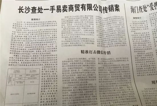 据报道,该案是这样的:经查明,2014年12月12日,当事人与李某签订《技术开发(委托)合同》,委托其定制开发互联网微信平台销售软件。2015年2月底,当事人推出的 微信营销平台正式上线,销售玛咖、面膜、白酒、红酒、茶叶等系列产品。当事人在推广政策和加盟模式中规定:个人购买398元的黑茶面膜(或不低于398元 的其他产品)可加盟或者成为拥有个人ID的公司微商。当事人通过在朋友圈中分享链接的方式,按照1个发展30个的裂变方式分层发展所谓“一分店”“二分 店”“三分店”,各级微商分店之间形成上下线关系。按照该公司计酬规定,上级微商均根据下级三个层次的微商的销售业绩计算和取得报酬。至案发,当事人在开展团队微信营销的过程中发展了1000余人成为公司微商。