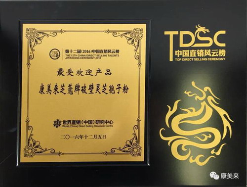 会上,康美来公司获评第十二届(2016)中国直销风云榜“新锐企业”,康美来芝寇牌破壁灵芝孢子粉获评第十二届(2016)中国直销风云榜“最受欢迎产品”。