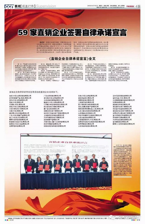 这张彩色整版广告,介绍了59家直销企业签署自律承诺宣传的经过。据编者介绍,2016年12月7-8日,2016中国直销行业规范发展国际交流研讨会在上海隆重召开。这次研讨会由国家工商行政管理总局反垄断与反不正当竞争执法局主办,上海市工商行政管理局协办,直销企业保护消费者权益联盟支持。会议期间,在国家工商行政管理总局反垄断与反不正当竞争执法局的指导、直销企业保护消费者权益联盟的倡议组织下,参会直销企业代表纷纷签署《直销企业自律承诺宣言》,向社会和广大消费者做出自己的庄严承诺。