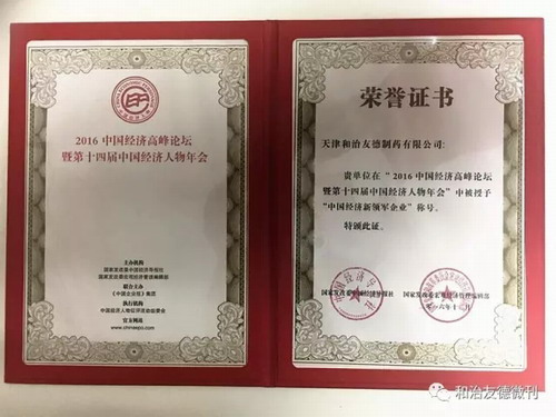 天津和治友德制药有限公司获“中国经济新领军企业”奖项