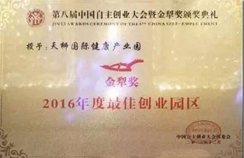 在第八届中国自主创业大会暨金犁奖典礼中,李金元董事长荣获“2016年度创业人物”,天狮国际健康产业园荣获“2016年度最佳创业园区”奖。