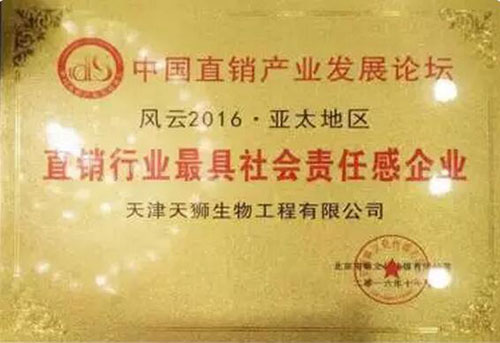 11月,天津天狮生物工程有限公司荣获中国直销产业发展论坛“风云2016.亚太地区-直销产业发展龙头企业”和“直销行业最具社会责任感企业”称号。