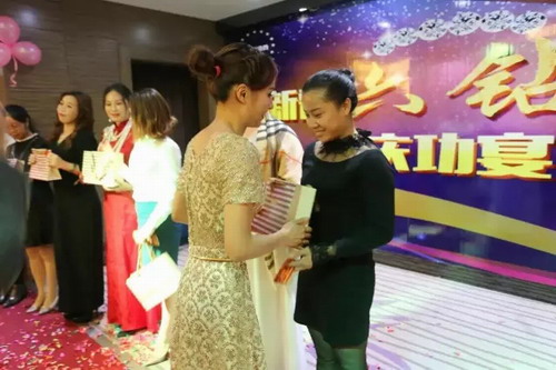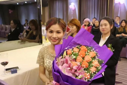 在全场家人们的欢呼中,华南区副总监徐嘉谟先生为吴彩兰女士颁发六钻经理荣誉胸章。