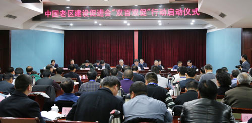国家发改委地区经济司副巡视员杨椠,国务院扶贫办社会扶贫司社会动员处处长王大洋,中央军委政治工作部群众工作局援建处处长庄国祥;中共十八届中央候补委员、中国老促会会长王健,执行会长石宝华,副会长司树杰,副会长兼秘书长李广文,副会长刘泽林、张建昂、杨葱龙出席会议。中国老促会全体理事,参加“双百双促”行动的扶贫企业领导,已完成结对的老区贫困村干部,完成结对的贫困村所在的县级老促会领导;有关合作、支持单位领导共190余人参加启动仪式。“双百双促”行动是中国老区建设促进会为深入贯彻落实习近平总书记关于扶贫开发和老区建设重要思想,在国家发改委和国务院扶贫办的指导下,在中国扶贫开发协会、中国进出口银行等20余家社团组织和金融机构的大力支持下开展的行动。即动员组织100 家爱心企业,结对帮建老区100 个贫困村,是促进老区贫困乡村率先脱贫、促进帮建企业优质发展的重要举措。