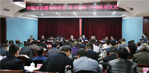 国家发改委地区经济司副巡视员杨椠,国务院扶贫办社会扶贫司社会动员处处长王大洋,中央军委政治工作部群众工作局援建处处长庄国祥;中共十八届中央候补委员、中国老促会会长王健,执行会长石宝华,副会长司树杰,副会长兼秘书长李广文,副会长刘泽林、张建昂、杨葱龙出席会议。中国老促会全体理事,参加“双百双促”行动的扶贫企业领导,已完成结对的老区贫困村干部,完成结对的贫困村所在的县级老促会领导;有关合作、支持单位领导共190余人参加启动仪式。“双百双促”行动是中国老区建设促进会为深入贯彻落实习近平总书记关于扶贫开发和老区建设重要思想,在国家发改委和国务院扶贫办的指导下,在中国扶贫开发协会、中国进出口银行等20余家社团组织和金融机构的大力支持下开展的行动。即动员组织100 家爱心企业,结对帮建老区100 个贫困村,是促进老区贫困乡村率先脱贫、促进帮建企业优质发展的重要举措。