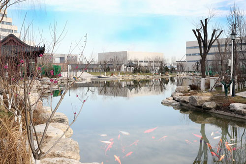 碧波荡漾的人工河有了生机:锦鲤在水面时隐时现;新植的荷花的粉红和碧绿在水面交映。桃花开了,梨花开了,淑女般的海棠花也开了。最喜人的是紫藤花,花瓣染红了绿罗裙,枝条上结满了累累的萌萌的豆荚芽。