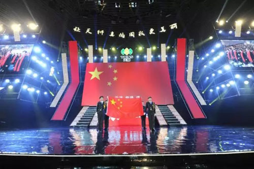 天狮国旗护卫队神圣庄严入场,参会人员全体起立、行注目礼,共同唱响中华人民共和国国歌,拉开2017年天狮大中华区业务启动大会的序幕。