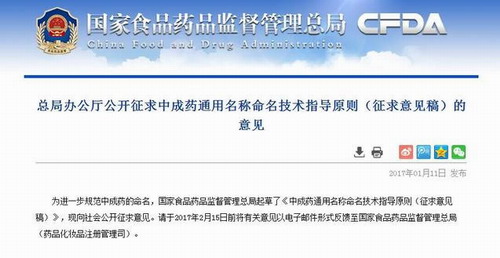 日前国家食药监总局印发《中成药通用名称命名技术指导原则(征求意见稿)》,指导原则不仅适用于中药新药的命名,也适用于对原有中成药不规范命名的规范,对于沿用已久的药名,如必须改动,可列出其曾用名作为过渡,过渡时间应按国务院药品监督管理部门的有关规定执行。