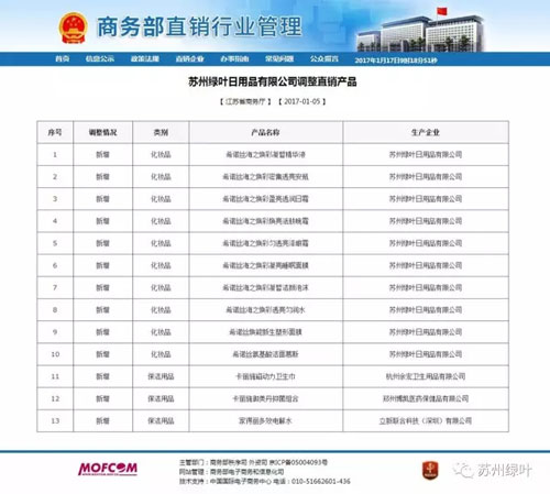 2017年1月5日,商务部直销行业管理信息系统公示:苏州绿叶日用品有限公司调整直销产品,新增希诺丝、卡丽施、家得丽三大系列共计13款产品。