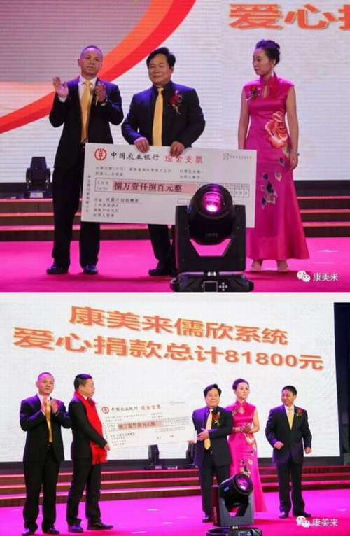 大会最后环节是儒欣系统响应公司号召,支持大别山区扶贫助学,系统领袖林岳兴、许弘、何云峰、蒋志伟带头每人捐款1万元,其他领导人和伙伴们踊跃捐款,向贫困小学生捐助81800元,康美来集团扶贫办主任金作述代表贫困学生接受捐款。结对助学,功德无量,儒欣精英具有看齐意识,展现了儒欣系统奉献爱心回报社会的慈善文化。