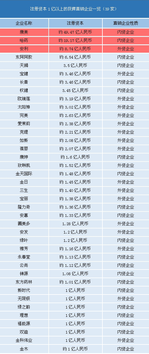 注册资本是公司制企业章程规定的全体股东或发起人认缴的出资额或认购的股本总额,一般用于公司日常经营运作、发放人员工资、进货等等。对此,直销博客网收集整理了各获牌直销企业的注册资本,并以当前汇率统一为人民币单位,以1亿元人民币为分水岭、划分了两大区间。