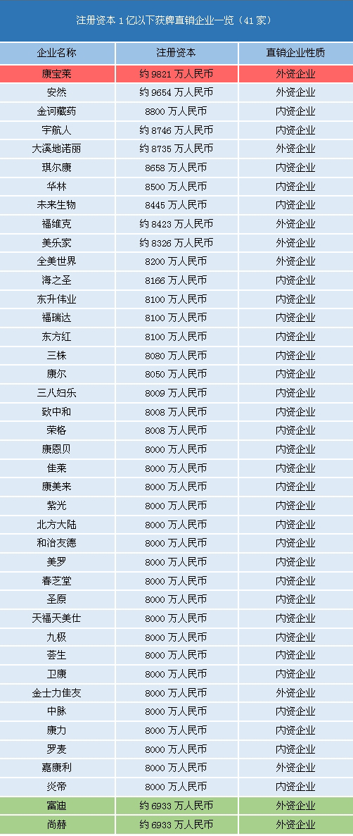 注册资本在1亿人民币以下的直销企业共有41家,内资企业有31家,占76%;外资企业有10家,占24%;其中以上市公司康宝莱注册资本最多,达到了约9821万人民币。