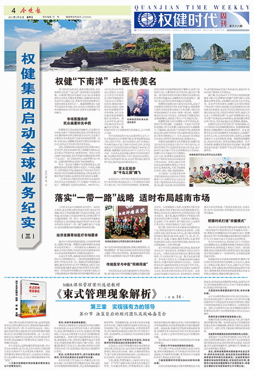 2017年1月20日,《今晚报•权健时代周刊》刊登《权健集团启动全球业务纪实(三)印尼篇、越南篇》,连载《束式管理现象解析》一书。