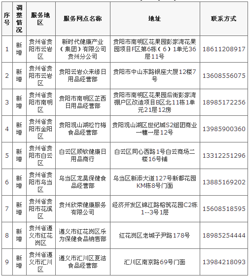 2017年1月20日,商务部直销行业管理信息系统网站公示新时代健康产业(集团)有限公司调整服务网点信息。新时代此次新增贵州省9个服务网点。详情如下: