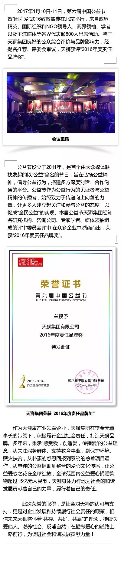 天狮荣获第六届中国公益节年度责任品牌奖