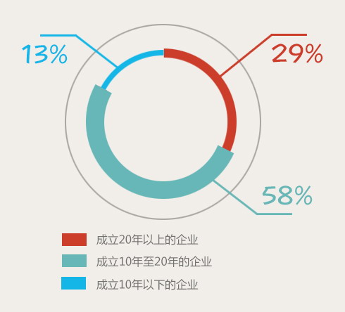 笔者将80家获牌企业按照注册成立的年限进行了划分,通过观察,笔者发现成立20年以上的企业有23家,占所有企业的近29%、成立10年至20年的企业有46家,占所有企业的近58%、成立10年以下的企业有11家,占所有企业的近13%。