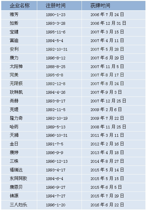 截止2017年1月22日,商务部直销行业管理信息系统网站一共公示了80家获牌企业,而近日行媒发布了一份直销企业2016年业绩榜单,从榜单的表现中看出整个行业虽增速放缓,但不少行业专家纷纷表态称经过优化调整后的直销行业在2017年将会发展得更好。笔者相信在春节之后陆陆续续又有许多新企将获牌,而在此之前笔者特意对目前已获牌的企业从注册成立时间及获牌时间方面做了以下梳理,仅供行业人士参考。