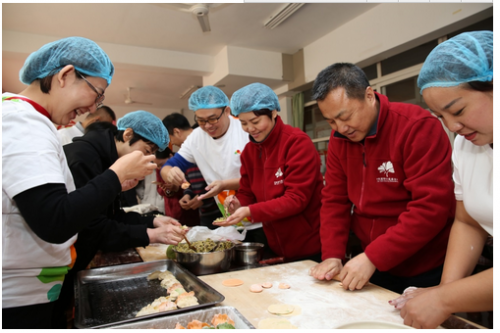而整场活动最让人难忘的就是,志愿者和老人们一起包饺子了。饺子,作为北方人新春佳节餐桌上不可或缺的食物,代表着团圆美满。今天,中脉志愿者的热情探访,让老人感觉到如同家一般的亲情温暖,吃一顿团圆美满的饺子就显得必不可少。我和面、你剁馅儿,中脉志愿者和老人们有说有笑、共同协作,不一会,就变戏法一样包出了很多饺子。