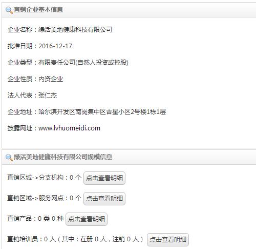 2017年1月31日,商务部直销行业信息管理系统网站公示绿活美地健康科技有限公司获得获得直销经营许可证信息。据商务部网站信息显示,绿活美地在2016年12月17日批准直销牌照,目前直销区域分支机构、服务网点、直销产品、直销培训员等信息暂未公布。详情如下: