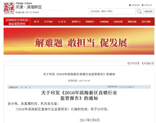 2016年2月6日,天津政务网发布了关于印发《2016年滨海新区直销行业监管报告》的通知。