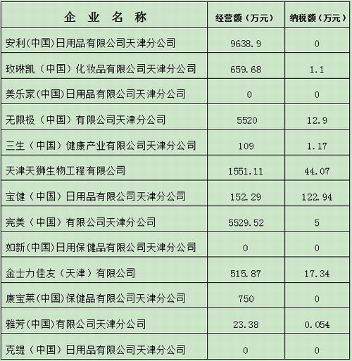 2.其他直销企业在滨海新区的情况。共有13家直销企业在滨海新区开展直销经营活动。分别是金士力佳友(天津)有限公司、天津天狮生物工程有限公司、如新(中国)日用保健品有限公司、宝健(中国)日用品有限公司、玫琳凯(中国)化妆品有限公司、三生(中国)健康产业有限公司、雅芳(中国)有限公司、康宝莱(中国)保健品有限公司、克缇(中国)日用品有限公司、美乐家(中国)日用品有限公司、安利(中国)日用品有限公司、完美(中国)有限公司、无限极(中国)有限公司。