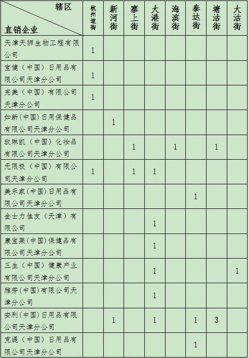 滨海新区注册的直销企业和直销企业分支机构共2家,天津尚赫保健品有限公司直销区域涉及天津、江西、山西、宁夏、辽宁、甘肃、内蒙古、河北、陕西、江苏的部分区域,在天津市的直销区域只限于市内六区;天津铸源健康科技集团有限公司的直销区域仅为天津市市内六区,滨海新区直销市场有待开发培育。其它13家直销企业在滨海新区开展直销经营活动,设立服务网点23个。滨海新区直销市场不够活跃,潜力较大。