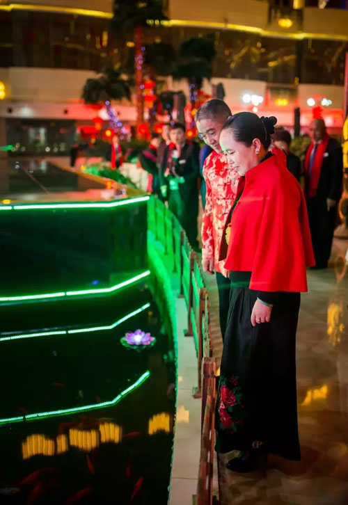随后,伙伴们一同来到铂丽斯大酒店一楼生态园,共同祈福。董事长刘润东先生和副董事长、总裁梁浩女士一同将铜钱挂到发财树上,寓意所有的安然家人们在2017年财旺福旺,安然事业蒸蒸日上,基业千秋!随后,安然家人们一同在生态园放花灯,许下自己的愿望。