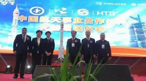 中国航天基金会秘书长张玉江少将(右三)为珍奥双迪颁发“中国航天事业合作伙伴”牌匾并赠送火箭模型。