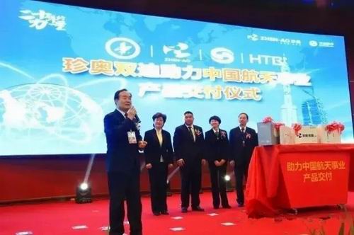 双迪股份董事长潘晓非(右二)、珍奥营销总裁张力、上海珍奥生物科技总经理冯琏向张玉江少将交付助力中国航天事业的部分珍奥双迪系列产品。